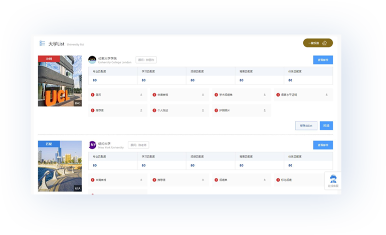 学生一键上传申请资料,平台直接投递对应学校,录取结果自动收取,offer一键查询